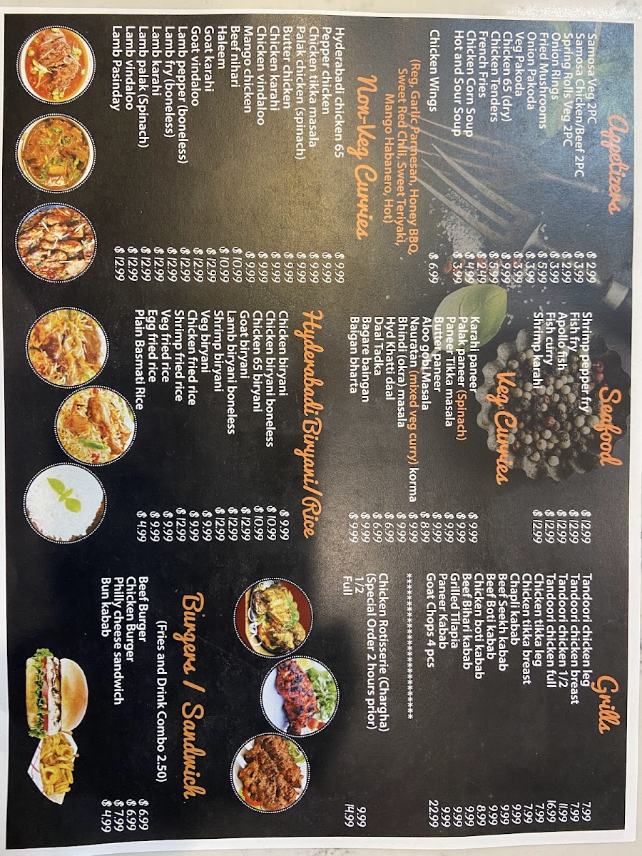 A colorful delicious platter containing of different kababslike Chicken and beef Sheekh, Tikka, Malai ,haryali, and bihari . The platter also contains fish and shrimp skewered in tandoor.