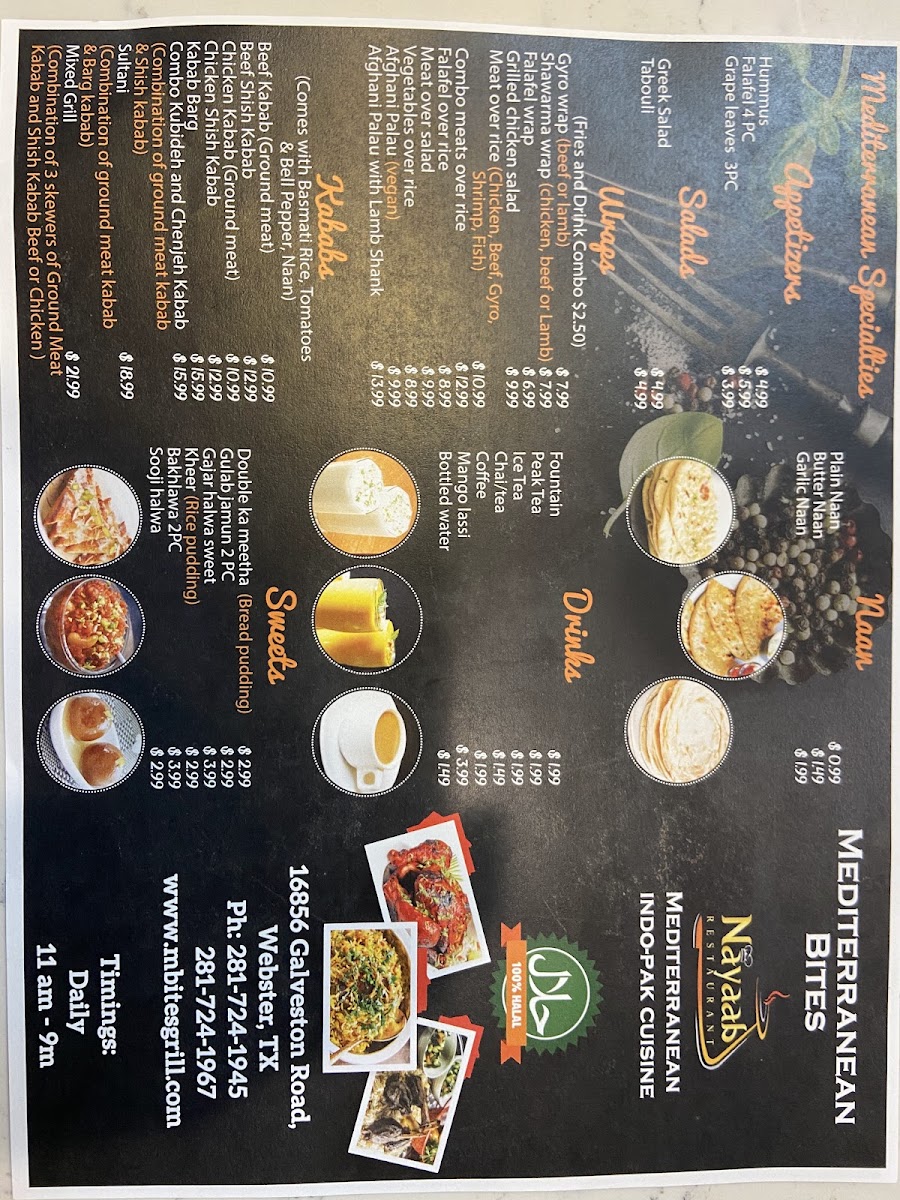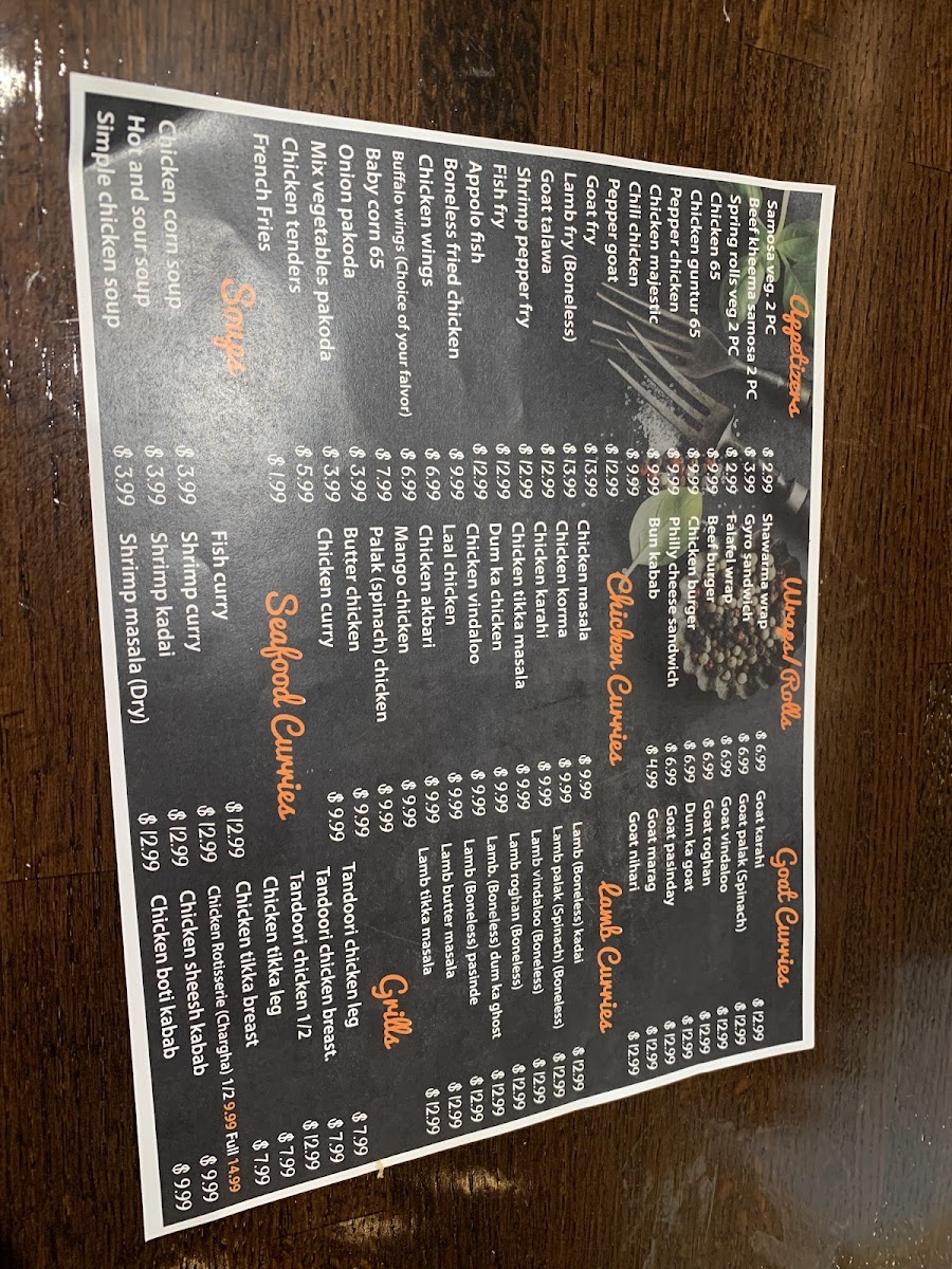 Paratha wrapped around choice of kabab (chicken sheekh, tikka, boti, or bihari) served with fries and assorted sodas (cola varieties, lemon-lime, Sprite, root beer, Fanta, Dr. Pepper).